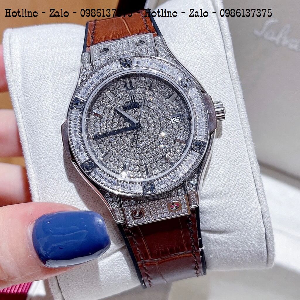 Đồng Hồ Hublot Đính Full Đá Nữ Da Silicon Nâu 34mm Silver