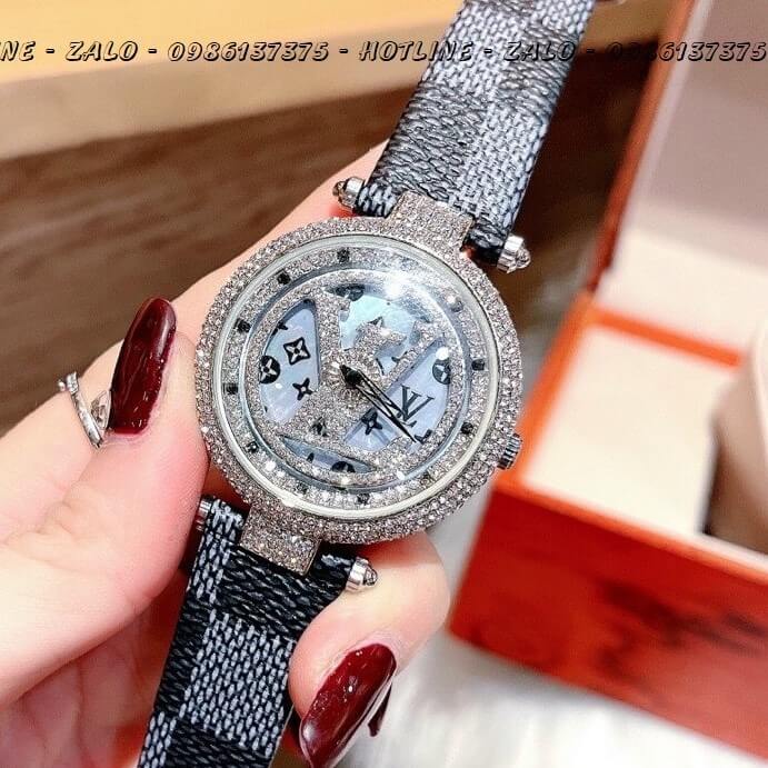 Đồng Hồ Nữ Louis Vuitton Mặt Xoay Dây Da Caro 37mm Silver
