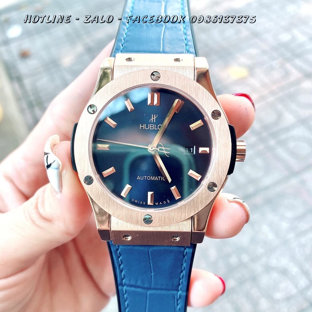 Đồng Hồ Nam Hublot Automatic Dây Da Silicon Xanh Rose Gold 42mm