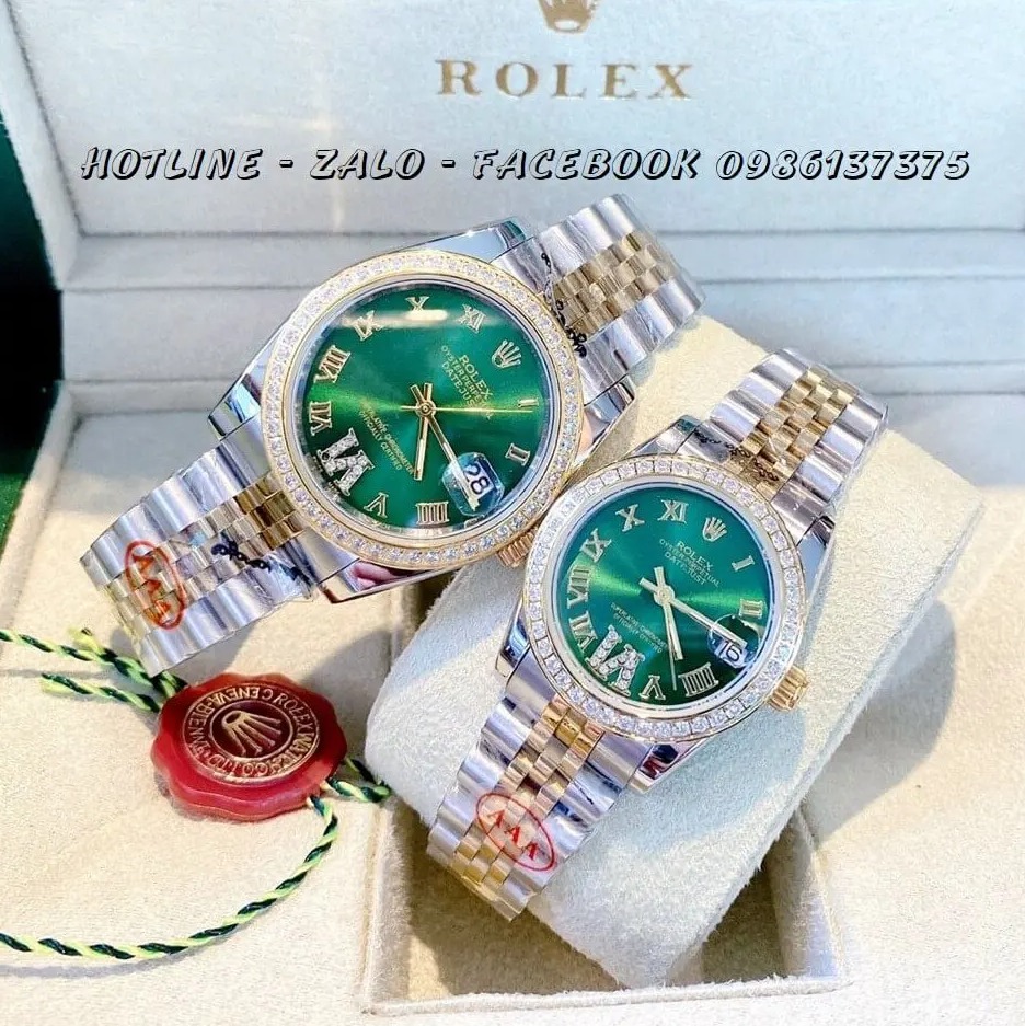 Đồng Hồ Cặp Rolex Quartz Đính Đá Vàng Mặt Xanh Đất 36mm - 32mm
