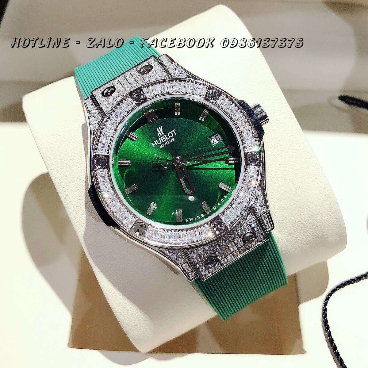 Đồng Hồ Nữ Hublot Đính Đá Dây Silicon Xanh 34mm - Silver