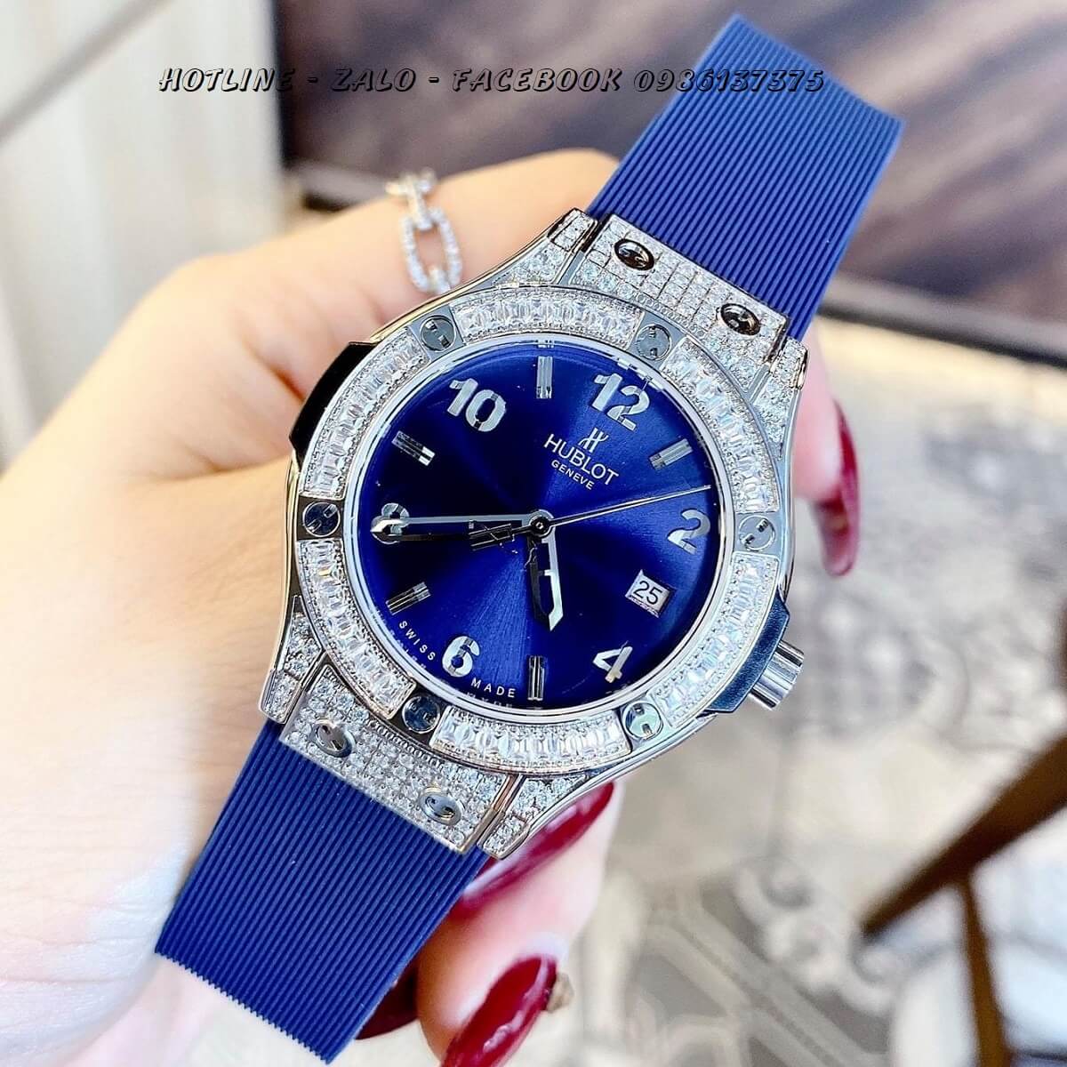 Đồng Hồ Hublot Nữ Dây Silicon Xanh Mặt Số Xanh Đá Trắng 34mm