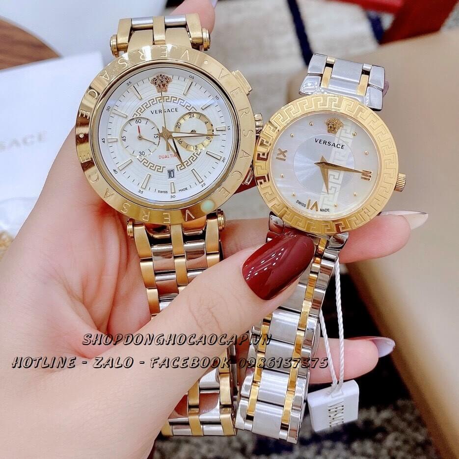 Đồng Hồ Versace Cặp Demi Vàng Mặt Trắng Nam Nữ 44mm - 35mm