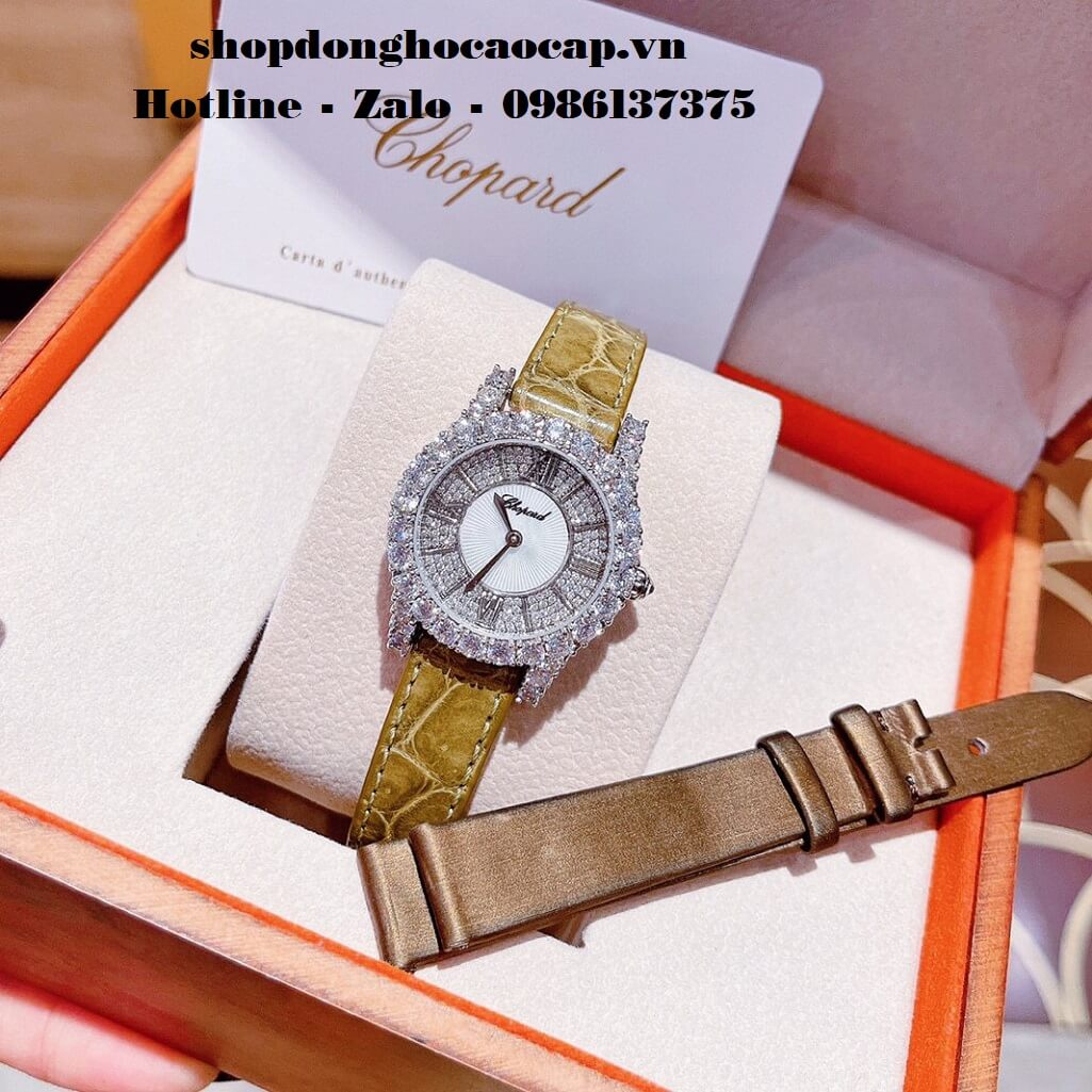 Set Đồng Hồ Chopard Nữ Dây Da Đính Đá Bạc 31mm Rêu - Nâu Đất